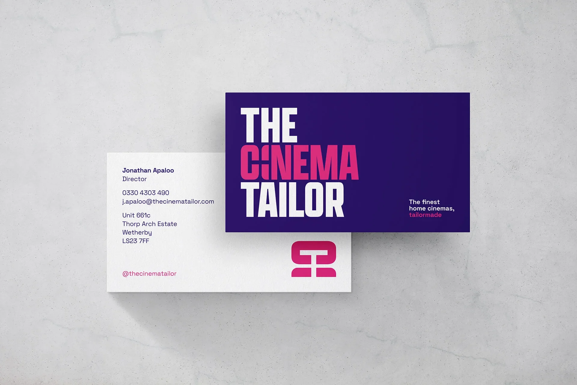 A logo and visual identity design for The Cinema Tailor. A luxury home cinema demonstration experience with showrooms in Leeds and Manchester.